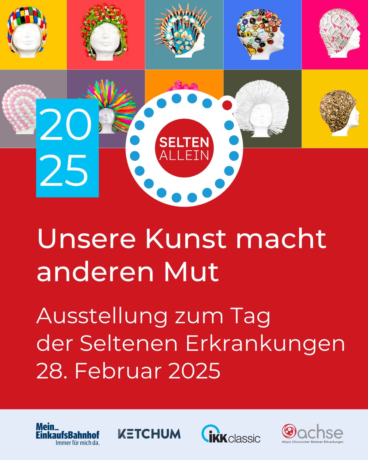 Die Ausstellung zeigt Selbstporträts, die Menschen mit seltenen Erkrankungen in den vergangenen Jahren und Monaten gemalt, gezeichnet oder fotografiert haben. Diese Werke werden jedes Jahr zusammen mit einer kurzen Selbstdarstellung der Person und ihrer Erkrankung an ausgewählten Orten präsentiert. So machen die Betroffenen auf den Welttag der Seltenen Erkrankungen und ihr persönliches Schicksal aufmerksam. Wir wollen den Mut der Künstler/-innen mit seltenen Erkrankungen teilen und sie damit unterstützen.